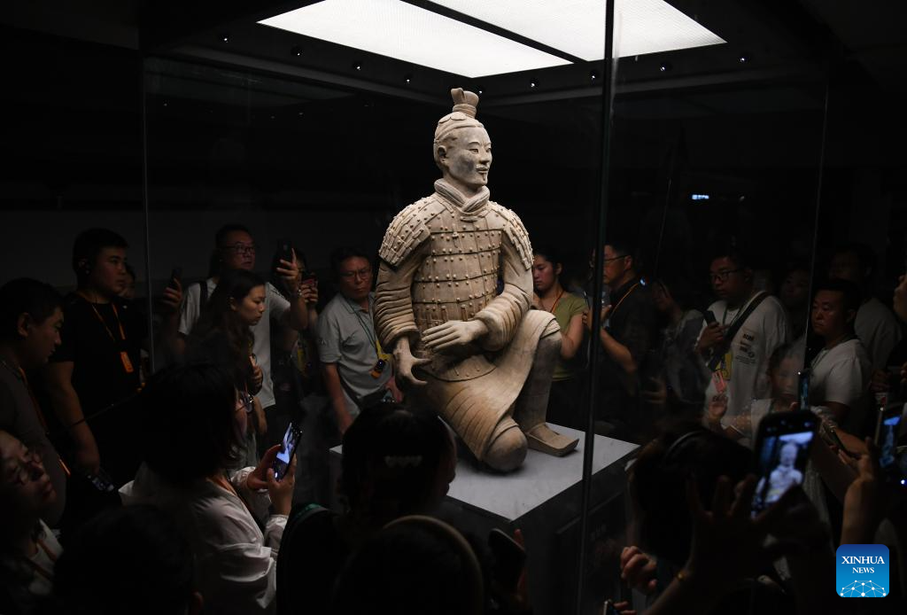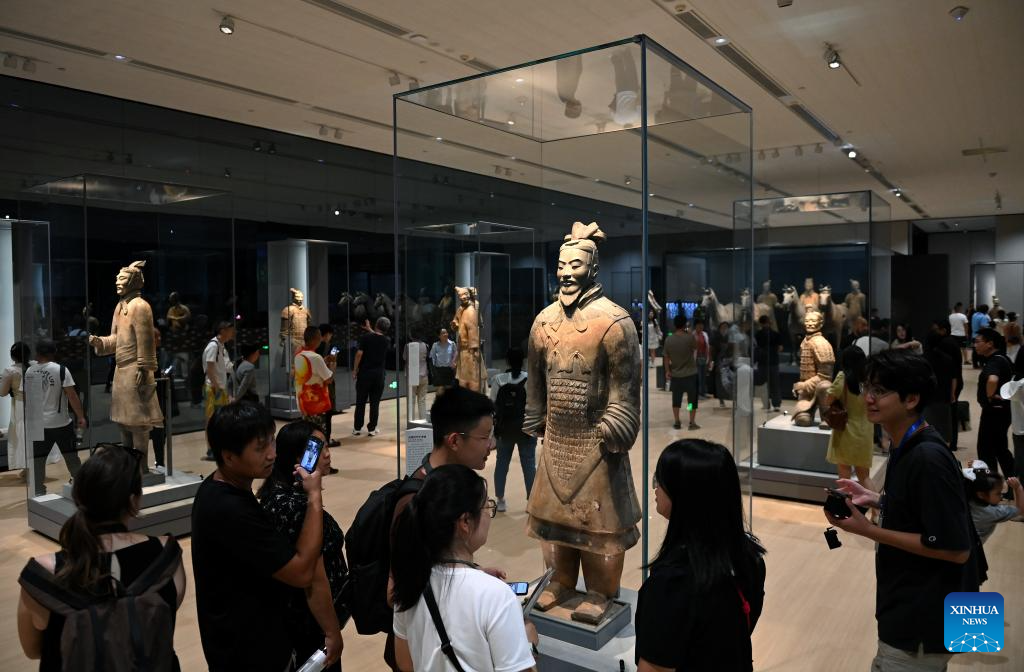Tourists look at a Terracotta Warrior at the Emperor Qinshihuang's Mausoleum Site Museum in Xi'an, northwest China's Shaanxi Province, Sept. 7, 2024. As the provincial capital of northwest China's Shaanxi Province, Xi'an, with a history of over 3,100 years, has served as the capital city for 13 dynasties of China. Under the policies of protection and utilization of cultural relics, the historical and cultural resources of Xi'an have been well preserved. (Xinhua/Zhang Bowen)