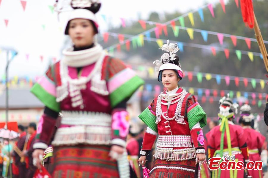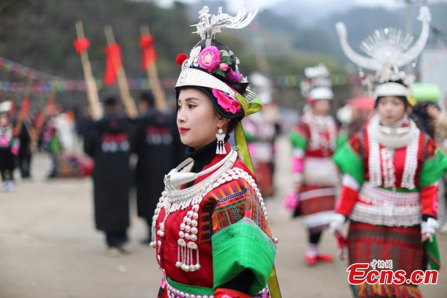 Women of the Miao ethnic group celebrate the "Wanghui" Festival in Danzhai county, southwest China's Guizhou Province, Mar. 15, 2018. (China News Service/Yang Wukui)