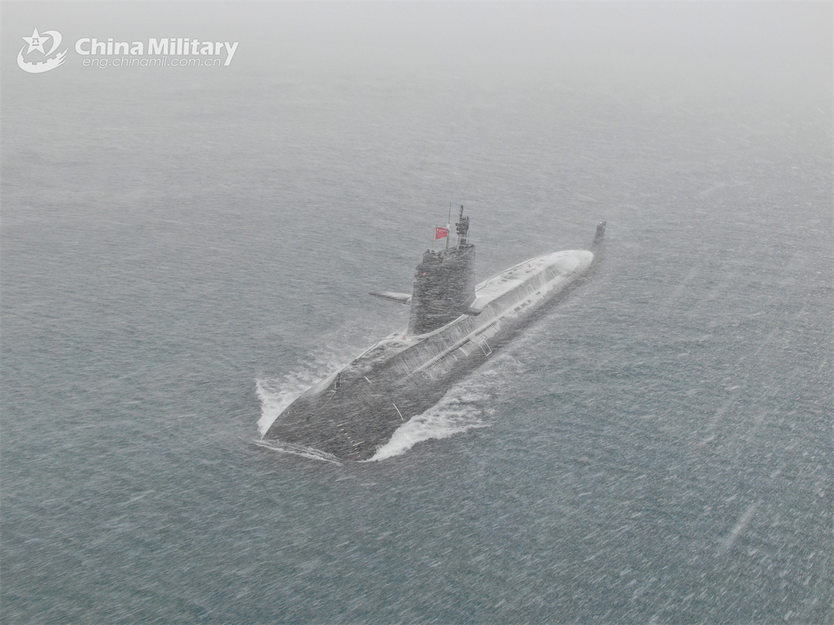 A submarine attached to a submarine flotilla with the navy under the Chinese PLA Northern Theater Command steams toward the designated area for a combat training exercise in mid-February 2025. (eng.chinamil.com.cn/Photo by Zhang Nan)