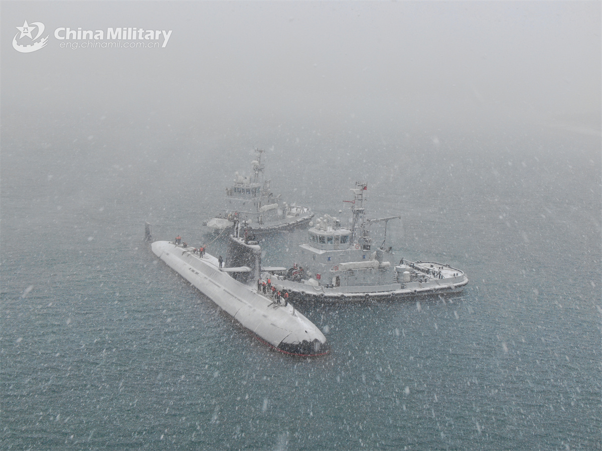 Two towboats attached to a submarine flotilla with the navy under the Chinese PLA Northern Theater Command jointly tow a submarine to bear off a port for a combat training exercise in mid-February 2025. (eng.chinamil.com.cn/Photo by Zhang Nan)