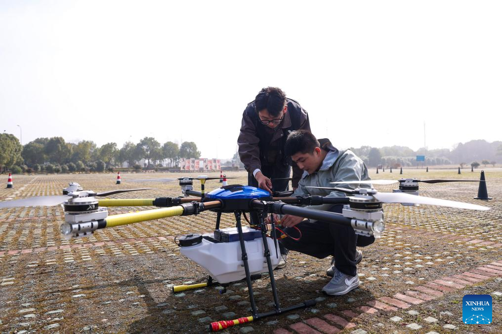 An instructor (L) supervises as a trainee changes battery for a drone at a low-altitude science and technology innovation base located in Jiangbei District, Ningbo, east China's Zhejiang Province, Feb 28, 2025.