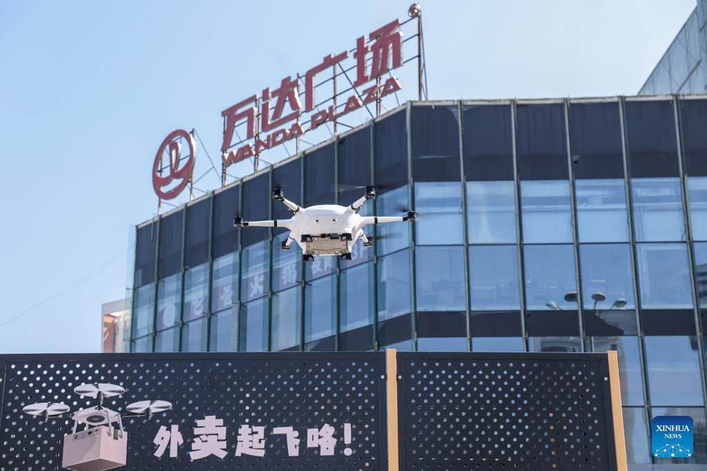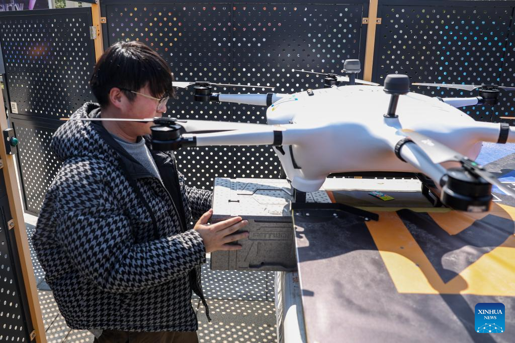 A drone is about to start delivery service at a mall in Jiangbei District, Ningbo City, Feb. 28, 2025. Ningbo is one of the pioneer cities for the country's pilot reform on low-altitude airspace administration and trial demonstration of general aviation industry. Jiangbei District has been boosting the "low-altitude economy" by cultivating industry-leading enterprises, improving industrial chains, creating industrial clusters, attracting talents and projects, and enriching application scenarios. It is now home to diversified enterprises and application scenarios related to the low-altitude economy, ranging from low-altitude aircraft manufacturing, drone flight training, to urban low-altitude logistics. (Xinhua/Jiang Han)