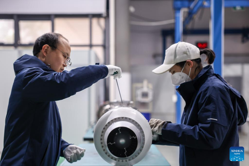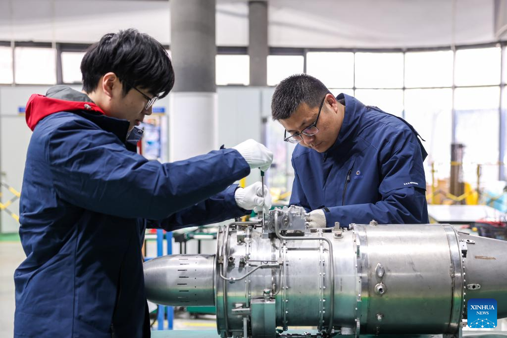 Workers assemble an engine for unmanned aerial vehicle (UAV) at a workshop in Jiangbei District, Ningbo City, Feb. 28, 2025. Ningbo is one of the pioneer cities for the country's pilot reform on low-altitude airspace administration and trial demonstration of general aviation industry. Jiangbei District has been boosting the "low-altitude economy" by cultivating industry-leading enterprises, improving industrial chains, creating industrial clusters, attracting talents and projects, and enriching application scenarios. It is now home to diversified enterprises and application scenarios related to the low-altitude economy, ranging from low-altitude aircraft manufacturing, drone flight training, to urban low-altitude logistics. (Xinhua/Jiang Han)