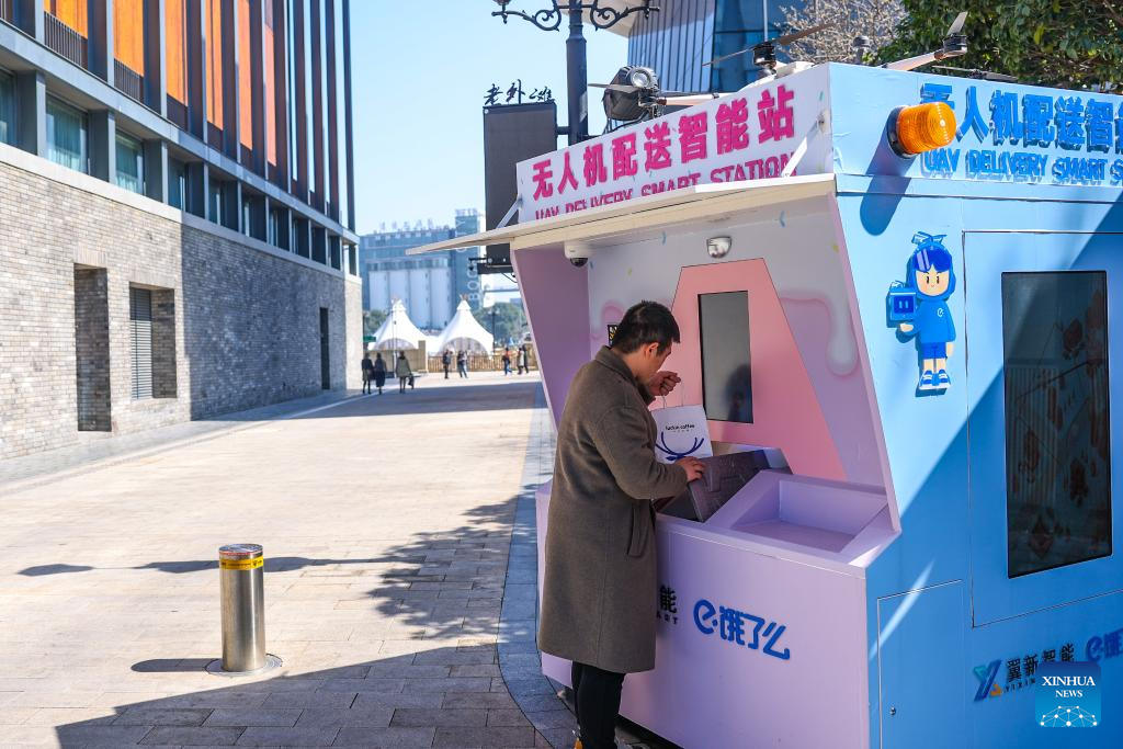 A man picks up his takeout at a UAV delivery smart station in Jiangbei District, Ningbo City, Feb. 28, 2025. Ningbo is one of the pioneer cities for the country's pilot reform on low-altitude airspace administration and trial demonstration of general aviation industry. Jiangbei District has been boosting the "low-altitude economy" by cultivating industry-leading enterprises, improving industrial chains, creating industrial clusters, attracting talents and projects, and enriching application scenarios. It is now home to diversified enterprises and application scenarios related to the low-altitude economy, ranging from low-altitude aircraft manufacturing, drone flight training, to urban low-altitude logistics. (Xinhua/Jiang Han)