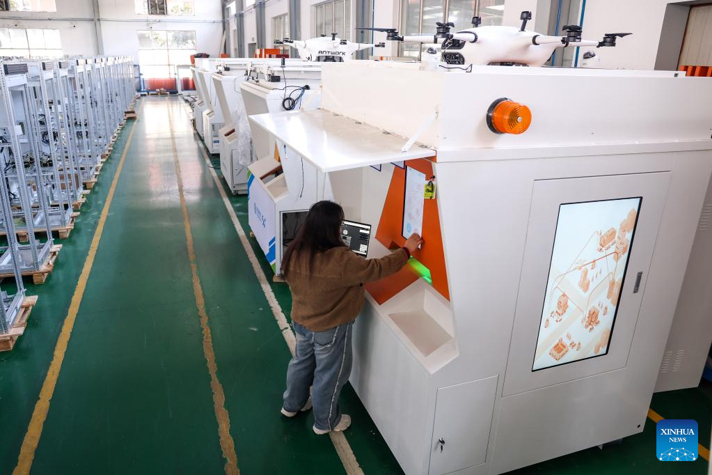 A staff member operates at a production line of UAV delivery smart stations in Jiangbei District, Ningbo City, Feb. 28, 2025. Ningbo is one of the pioneer cities for the country's pilot reform on low-altitude airspace administration and trial demonstration of general aviation industry. Jiangbei District has been boosting the "low-altitude economy" by cultivating industry-leading enterprises, improving industrial chains, creating industrial clusters, attracting talents and projects, and enriching application scenarios. It is now home to diversified enterprises and application scenarios related to the low-altitude economy, ranging from low-altitude aircraft manufacturing, drone flight training, to urban low-altitude logistics. (Xinhua/Jiang Han)