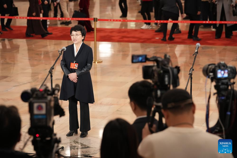Zhou Lan, a member of the 14th National Committee of the Chinese People's Political Consultative Conference (CPPCC), attends a group interview ahead of the opening meeting of the third session of the 14th CPPCC National Committee at the Great Hall of the People in Beijing, capital of China, March 4, 2025. (Xinhua/Yin Gang)