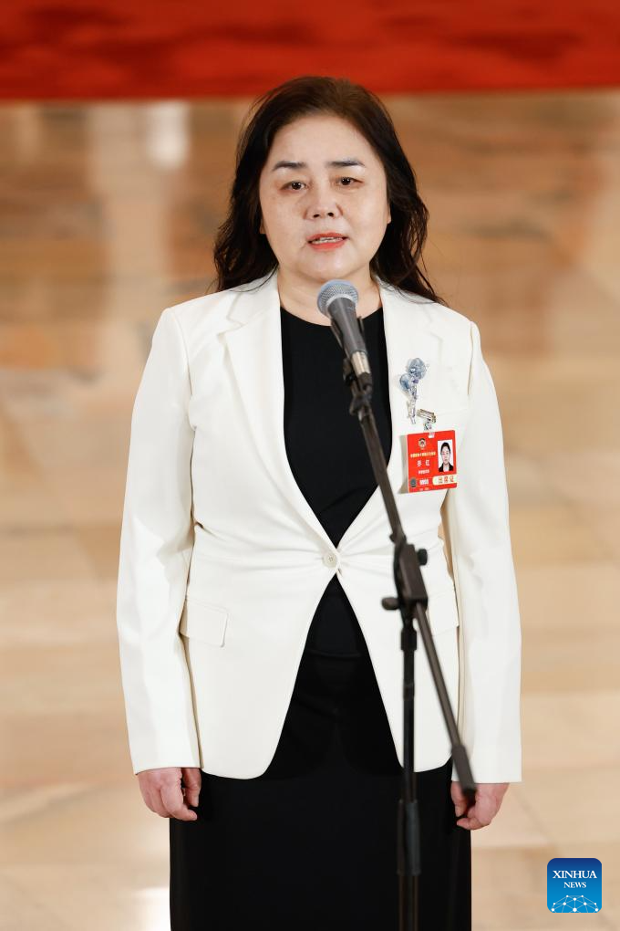 Jin Li, a member of the 14th National Committee of the Chinese People's Political Consultative Conference (CPPCC), attends a group interview ahead of the opening meeting of the third session of the 14th CPPCC National Committee at the Great Hall of the People in Beijing, capital of China, March 4, 2025. (Xinhua/Yin Gang)