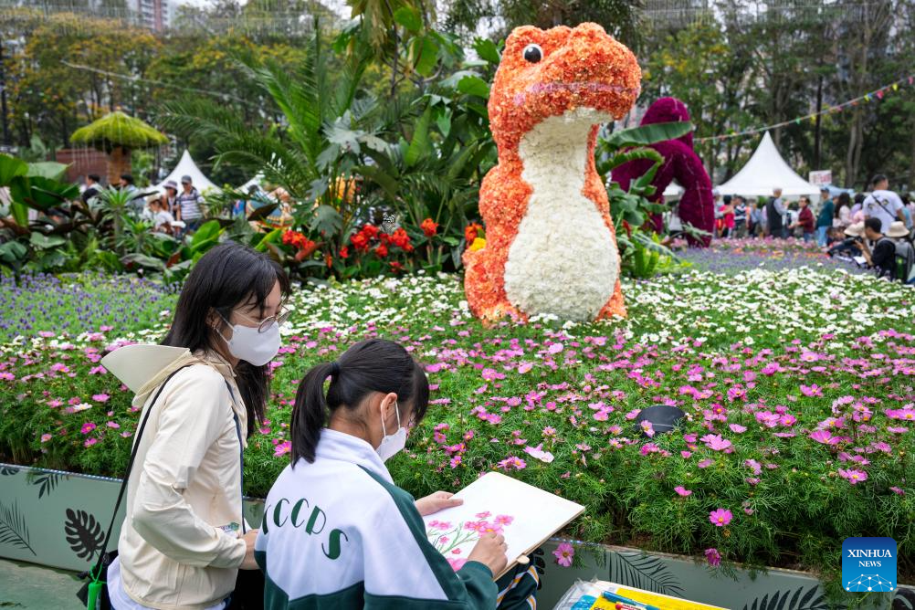 Visitors take photos during Hong Kong Flower Show 2025 at the Victoria Park in south China's Hong Kong, March 14, 2025. The flower show kicked off here on Friday and will last until March 23. (Xinhua/Zhu Wei)