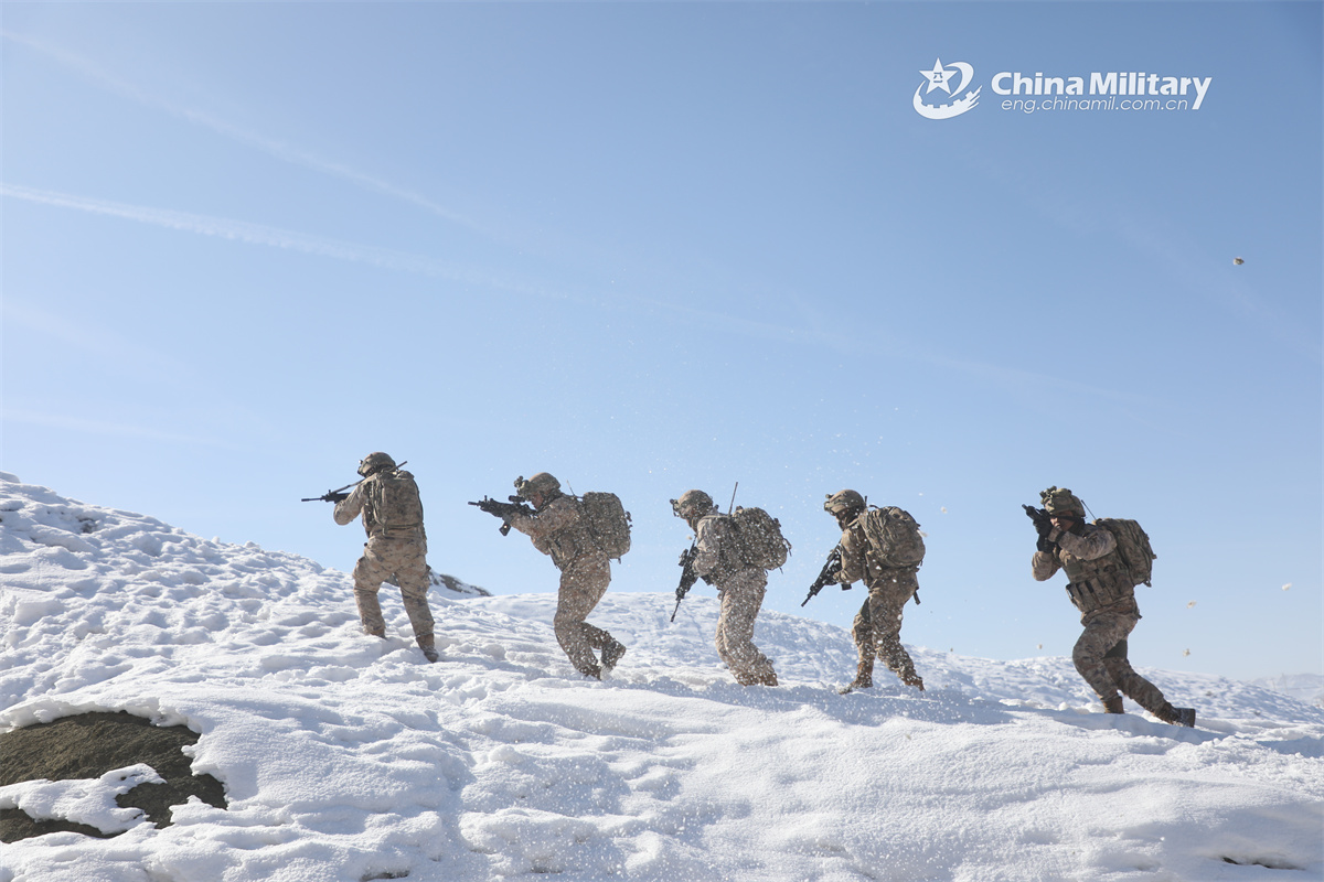 Soldiers assigned to a reconnaissance detachment of a regiment under the Chinese PLA Xinjiang Military Command march in combat formation during a multi-subject training exercise on February 24, 2025. (eng.chinamil.com.cn/Zhang Shihong)