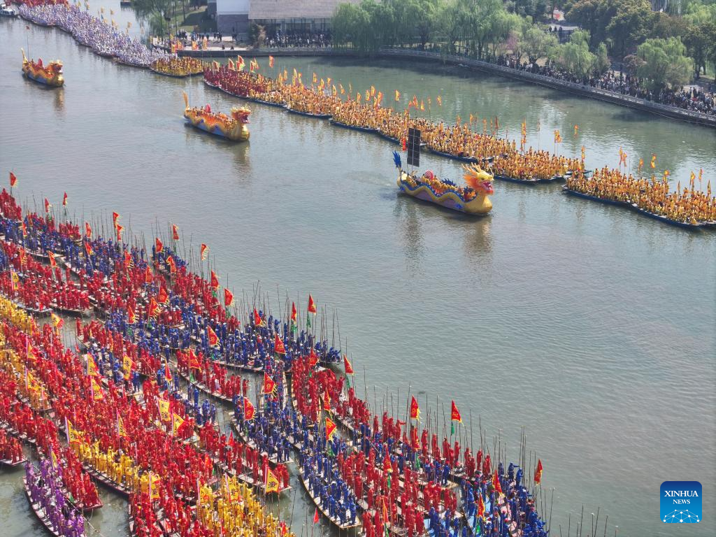 An aerial drone photo taken on April 6, 2025 shows people participating in a boat performance during the 2025 Qintong Boat Festival held at Qinhu National Wetland Park in Jiangyan District of Taizhou, east China's Jiangsu Province. Over five hundred boats with more than 10,000 boat team members aboard gathered here on Sunday for the Qintong Boat Festival, which has been a centuries-old tradition. The Qintong Boat Festival was listed as the state-level intangible cultural heritage in 2008. (Xinhua/Ji Chunpeng)