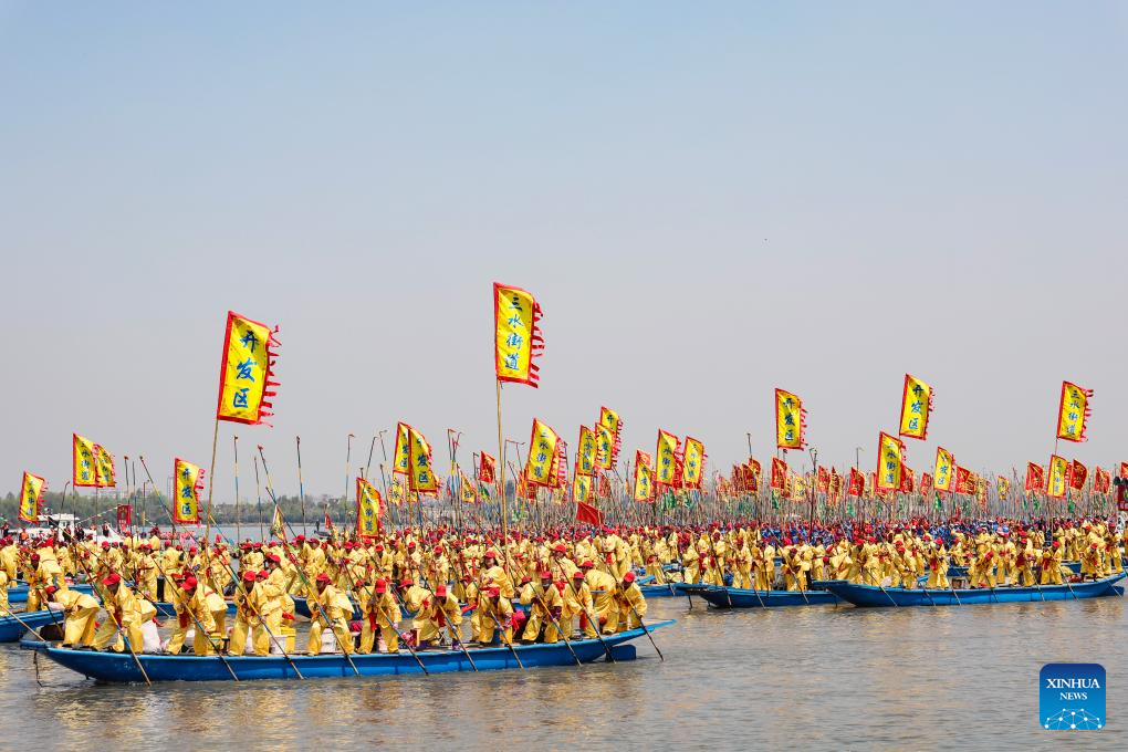 People participate in a boat performance during the 2025 Qintong Boat Festival held at Qinhu National Wetland Park in Jiangyan District of Taizhou, east China's Jiangsu Province on April 6, 2025. Over five hundred boats with more than 10,000 boat team members aboard gathered here on Sunday for the Qintong Boat Festival, which has been a centuries-old tradition. The Qintong Boat Festival was listed as the state-level intangible cultural heritage in 2008. (Photo by Lan Hongguang/Xinhua)