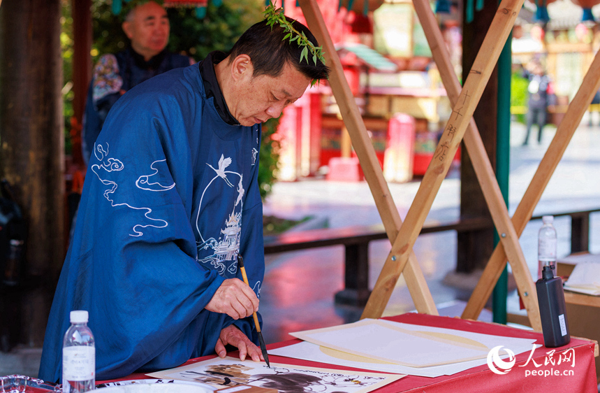 An artist creates a traditional Chinese ink and wash painting at a fair featuring intangible cultural heritage at the Millennium City Park in Kaifeng city, central China's Henan Province, during the 2025 Kaifeng Qingming Cultural Festival. (People's Daily Online/Xiao Yimu)