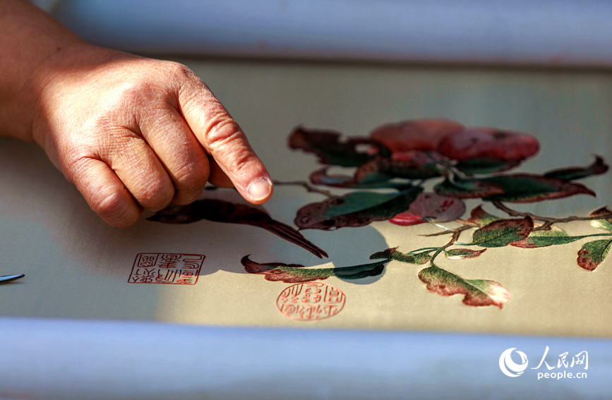 Photo shows an artwork created using the craft of Bian embroidery, a traditional Chinese embroidery style originating from Kaifeng city in central China's Henan Province. The embroidery style is known for its bright colors and exquisite stitching. (People's Daily Online/Xiao Yimu)