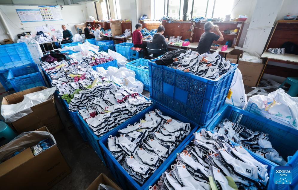 Workers pack socks at Zhuji Yuanjin Textile Co., Ltd. in Zhuji City, east China's Zhejiang Province on April 10, 2025. (Xinhua/Xu Yu)
