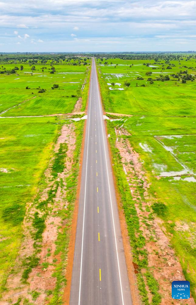 An aerial drone photo taken on July 14, 2024 shows the National Road 71C in Tbong Khmum province, Cambodia. (Photo by Nitola/Xinhua)
