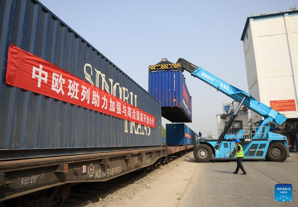 A reach stacker loads a container onto a China-Europe freight train bound for Moscow of Russia at a logistics center in Beijing, capital of China, April 16, 2025. Beijing on Wednesday sent its first China-Europe freight train in 2025. It is estimated that the train will cover a distance of about 9000 kilometers in 16 days. (Xinhua/Zhang Chenlin)