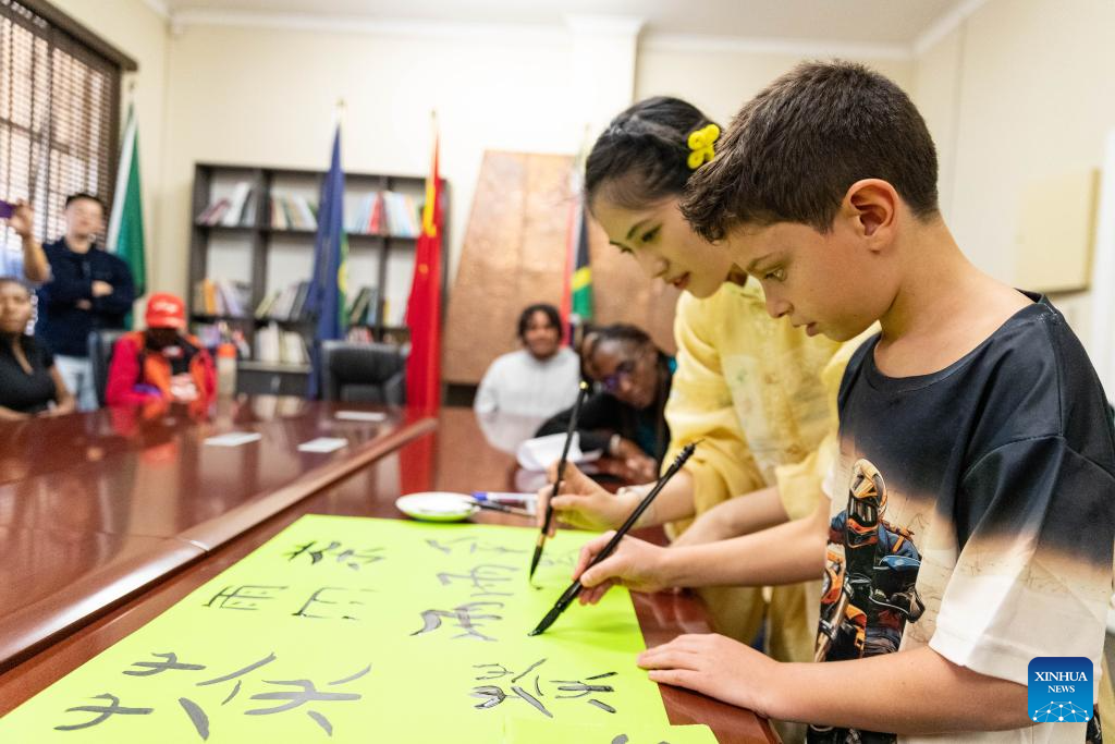 A student and a Confucius Institute volunteer write Chinese calligraphy during an event celebrating the upcoming International Chinese Language Day at the Confucius Institute at the University of Johannesburg in Johannesburg, South Africa, April 17, 2025. (Xinhua/Zhang Yudong)