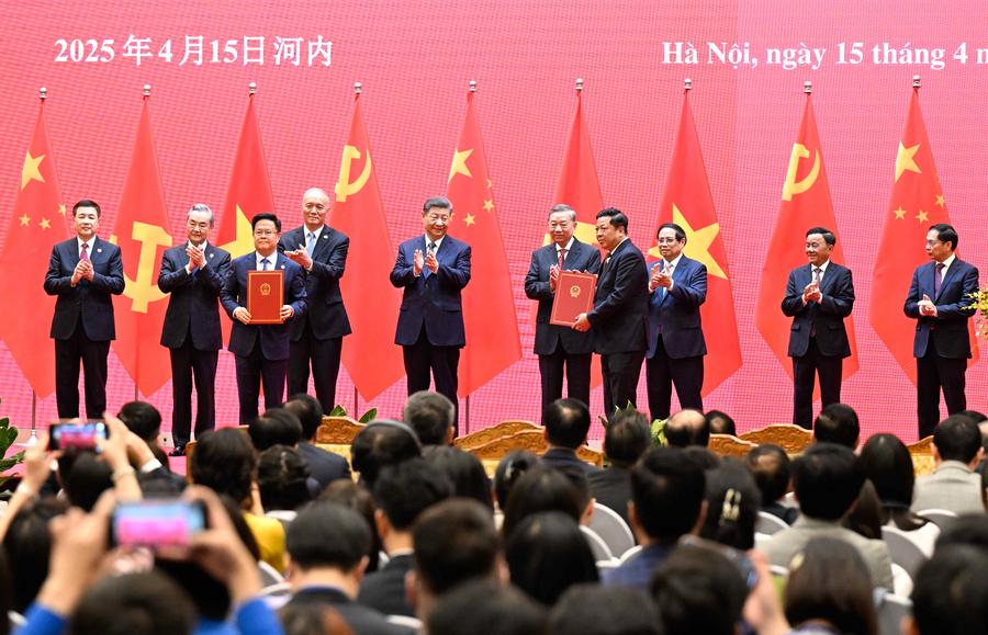 Chinese President Xi Jinping, also general secretary of the Communist Party of China (CPC) Central Committee, General Secretary of the Communist Party of Vietnam Central Committee To Lam and Vietnamese Prime Minister Pham Minh Chinh jointly witness the launching ceremony of the China-Vietnam railway cooperation mechanism at the International Convention Center in Hanoi, capital of Vietnam, April 15, 2025. (Xinhua/Shen Hong)