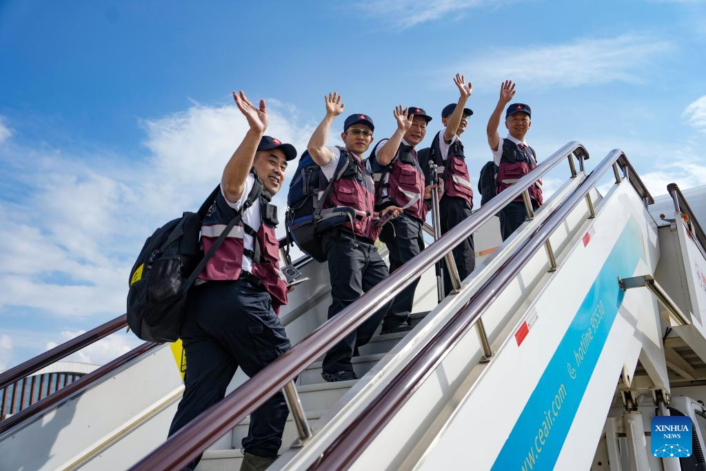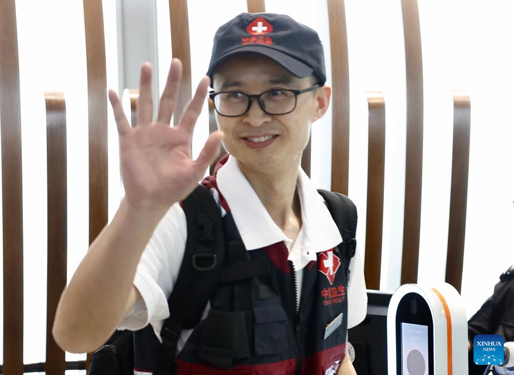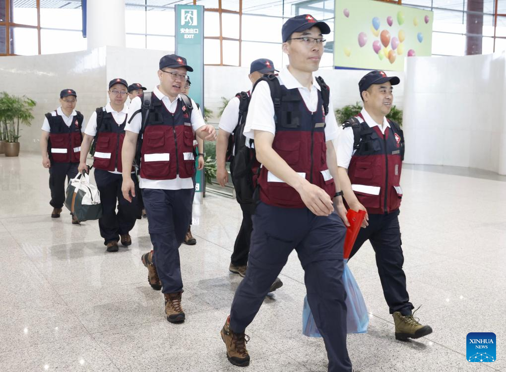 Members of a public health team to Myanmar depart from Beijing Capital International Airport in Beijing, capital of China, April 19, 2025. A 50-member Chinese public health team departed for Myanmar on Saturday to support post-earthquake public health efforts there. The 7.9-magnitude earthquake, which jolted Myanmar on March 28, has claimed 3,726 lives and left 5,105 people injured, with 129 others remaining unaccounted for as of April 18, according to Myanmar's State Administration Council Information Team on April 19. (Xinhua/Zhang Yuwei)