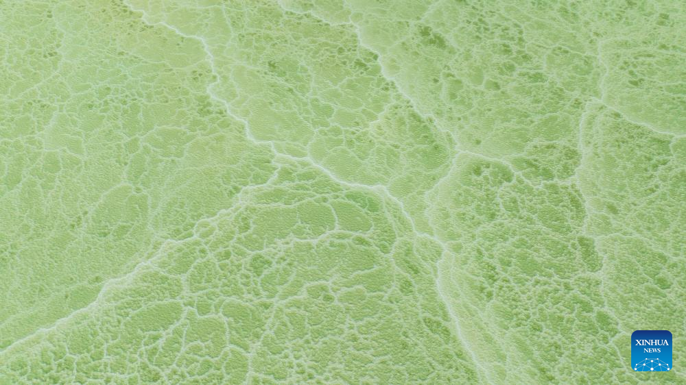 An aerial drone photo taken on April 19, 2025 shows the Jade Lake in Mangya, Haixi Mongolian and Tibetan Autonomous Prefecture of northwest China's Qinghai Province. Because of the difference in its depth and the concentration of minerals in the water, the Jade Lake takes on a number of hues, making it a popular scenic spot. (Xinhua/Wang Bo)