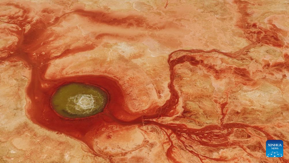 An aerial drone photo taken on April 19, 2025 shows the Aiken Spring in Mangya, Haixi Mongolian and Tibetan Autonomous Prefecture of northwest China's Qinghai Province. Located in northwest China's Qinghai Province, Aiken Spring is dubbed the "Eye of the Earth." This rare geological wonder forms a unique pupil shape from above, with spring water and surrounding deep red sediments resembling an eye embedded in the land. (Xinhua/Wang Bo)