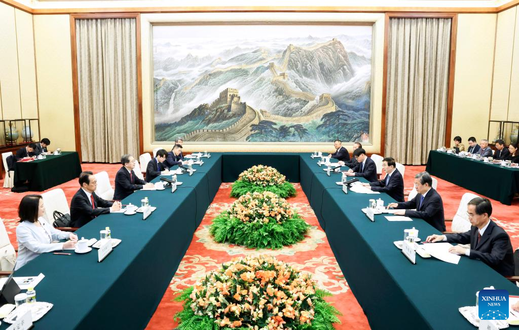 Wang Huning, a member of the Standing Committee of the Political Bureau of the Communist Party of China (CPC) Central Committee and chairman of the Chinese People's Political Consultative Conference National Committee, meets with a delegation from Japan's Komeito Party, led by its leader Tetsuo Saito, in Beijing, capital of China, April 23, 2025. (Xinhua/Pang Xinglei)