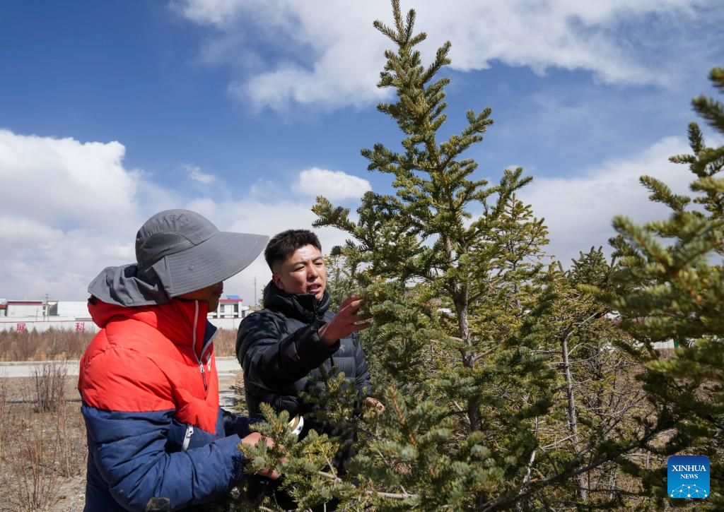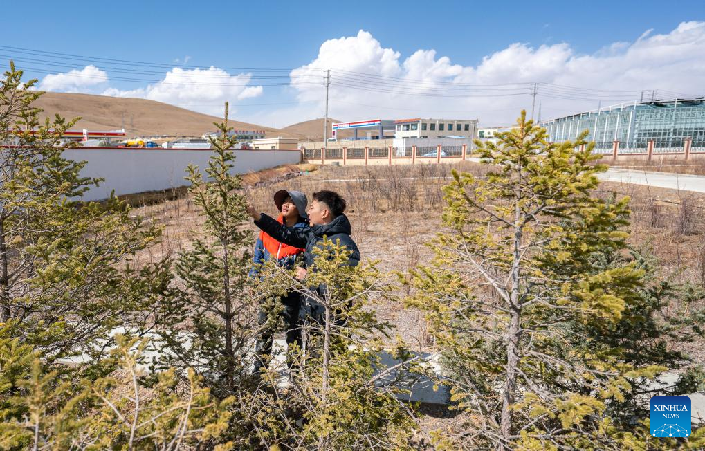 Staff members inspect the growth of trees in Nagqu, southwest China's Xizang Autonomous Region, April 25, 2025. Nagqu City has an average altitude of 4,500 meters. Due to the unfavorable conditions for tree growth, such as permafrost, low temperature, frequent strong wind throughout the year, it was once the only prefecture-level city in China without trees used for urban greening.