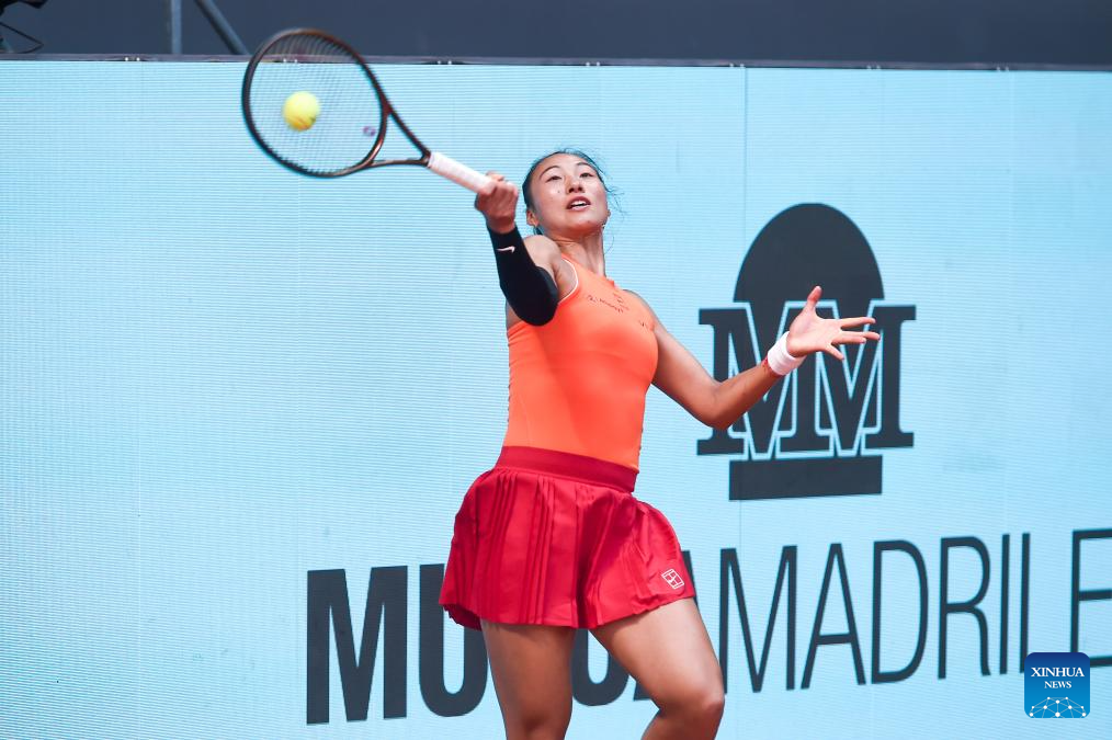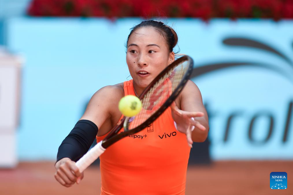 Zheng Qinwen hits a return during the women's singles round of 64 match between Zheng Qinwen of China and Anastasia Potapova of Russia at the Madrid Open tennis tournament in Madrid, Spain, April 25, 2025. (Photo by Gustavo Valiente/Xinhua)