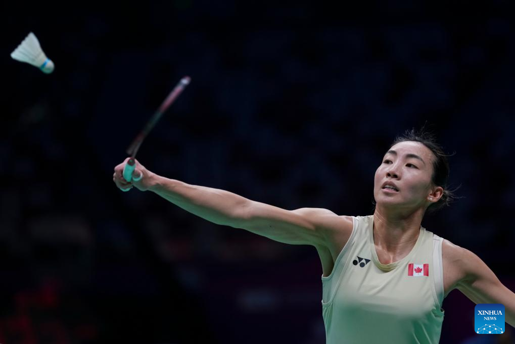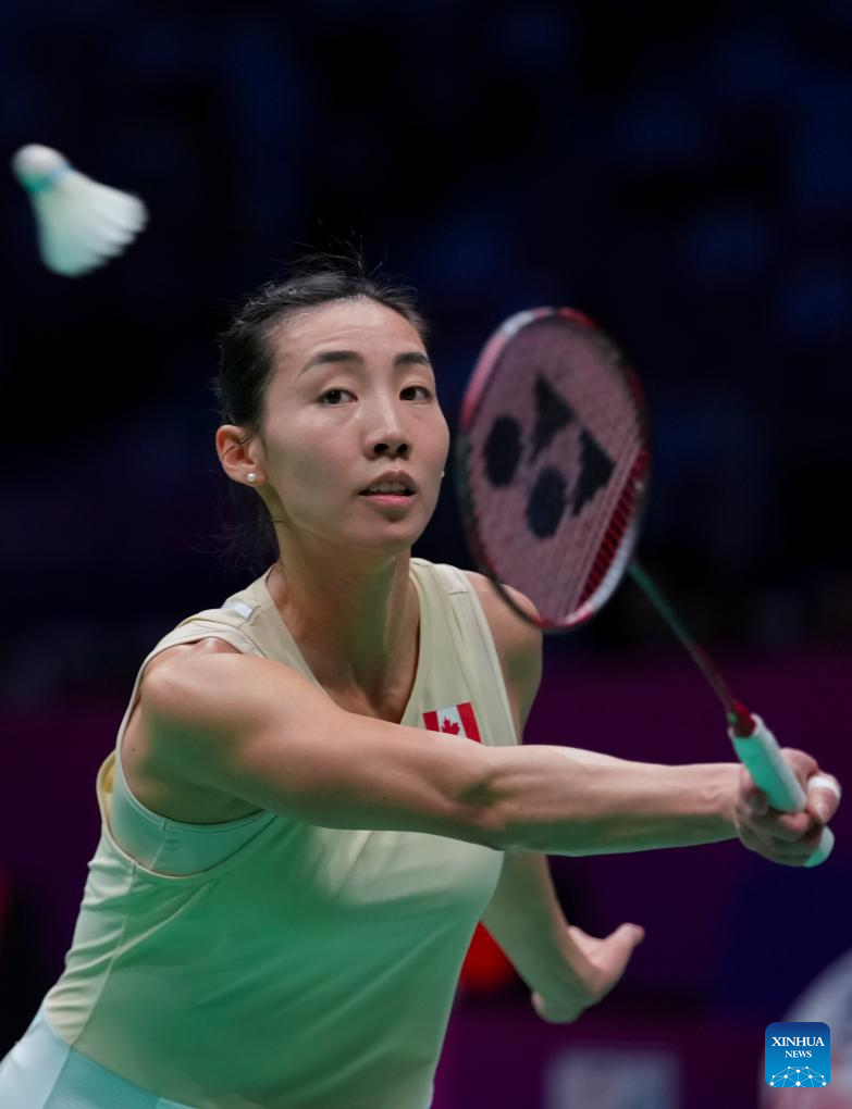 Michelle Li of Canada hits a return during the women's singles match against An Se Young of South Korea during the Group A match between South Korea and Canada at BWF Sudirman Cup in Xiamen, southeast China's Fujian Province, April 28, 2025. (Xinhua/Sun Fei)