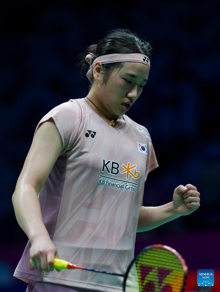 An Se Young of South Korea celebrates scoring during the women's singles match against Michelle Li of Canada during the Group A match between South Korea and Canada at BWF Sudirman Cup in Xiamen, southeast China's Fujian Province, April 28, 2025. (Xinhua/Sun Fei)