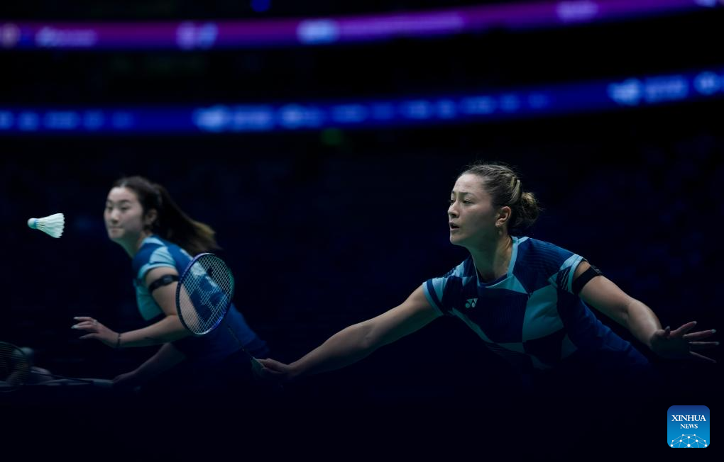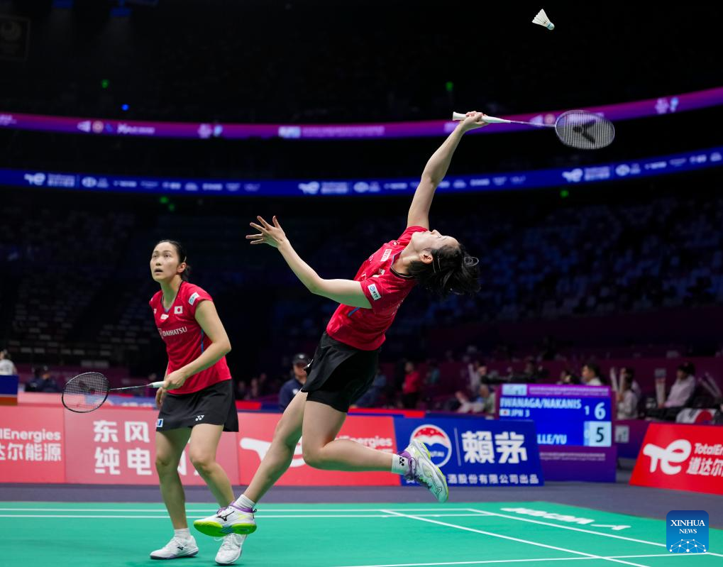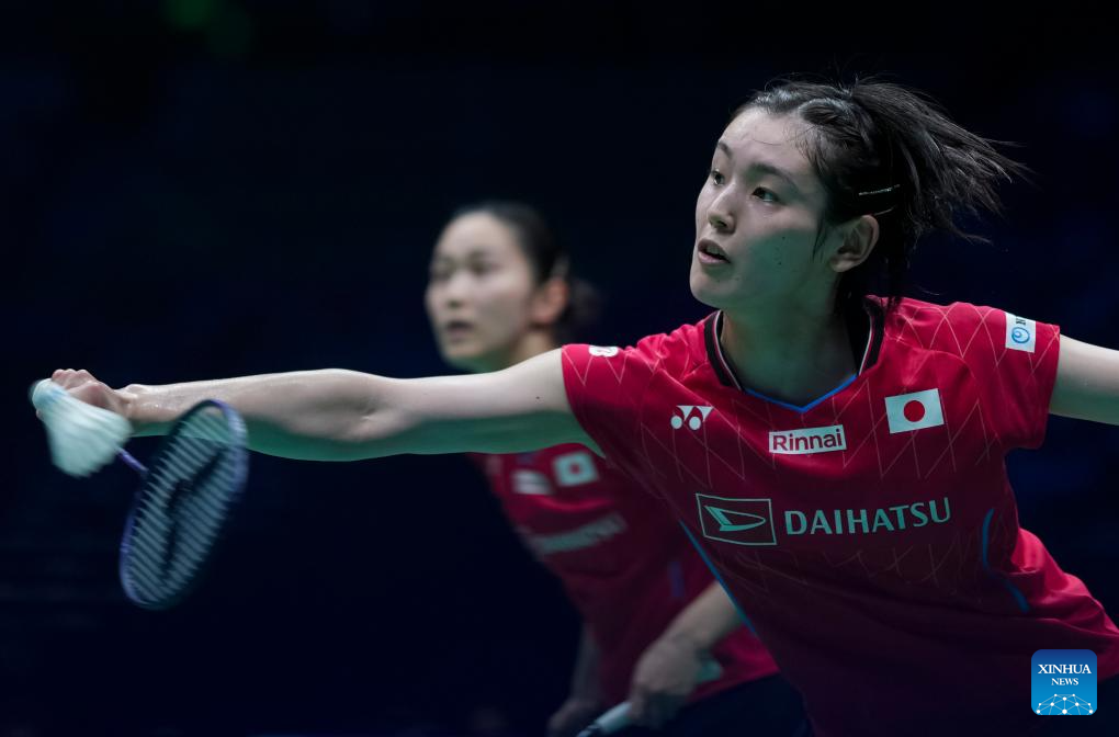 Iwanaga Rin (R) /Nakanishi Kie of Japan compete in the women's doubles match against Gronya Somerville/Angela Yu of Australia during the group C match between Japan and Australia at BWF Sudirman Cup in Xiamen, southeast China's Fujian Province, April 28, 2025. (Xinhua/Sun Fei)