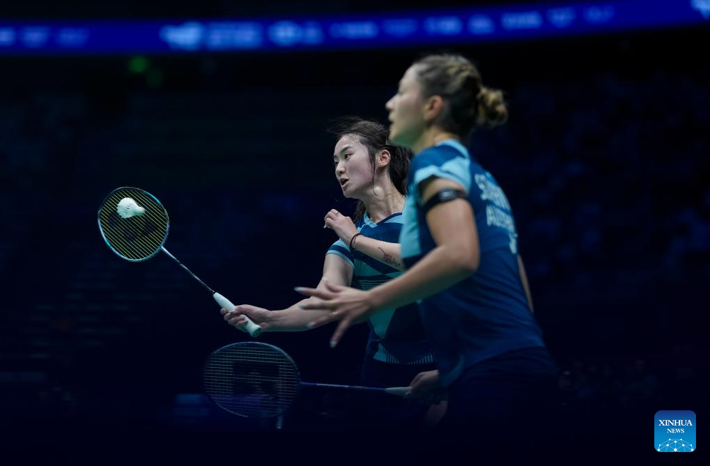 Gronya Somerville (R) /Angela Yu of Australia compete in the women's doubles match against Iwanaga Rin/Nakanishi Kie of Japan during the group C match between Japan and Australia at BWF Sudirman Cup in Xiamen, southeast China's Fujian Province, April 28, 2025. (Xinhua/Sun Fei)