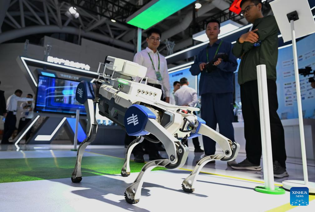 A robot simulates to patrol inspection of transformer substation at the experience area of the 8th Digital China Summit in Fuzhou, southeast China's Fujian Province, April 28, 2025. With more than 300 professional institutions attending, the 8th Digital China Summit opened its experience area to professional visitors on Monday, showcasing the nation's digital transformation achievements amid robust growth in the digital sector. (Xinhua/Lin Shanchuan)