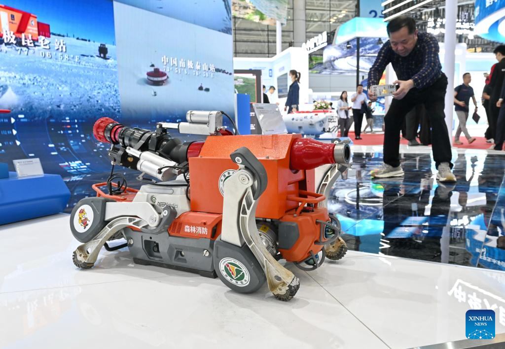 This photo taken on April 28, 2025 shows a firefighting robot at the experience area of the 8th Digital China Summit in Fuzhou, southeast China's Fujian Province. With more than 300 professional institutions attending, the 8th Digital China Summit opened its experience area to professional visitors on Monday, showcasing the nation's digital transformation achievements amid robust growth in the digital sector. (Xinhua/Lin Shanchuan)