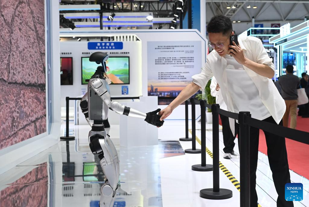 A visitor interacts with a humanoid robot at the experience area of the 8th Digital China Summit in Fuzhou, southeast China's Fujian Province, April 28, 2025. With more than 300 professional institutions attending, the 8th Digital China Summit opened its experience area to professional visitors on Monday, showcasing the nation's digital transformation achievements amid robust growth in the digital sector. (Xinhua/Lin Shanchuan)