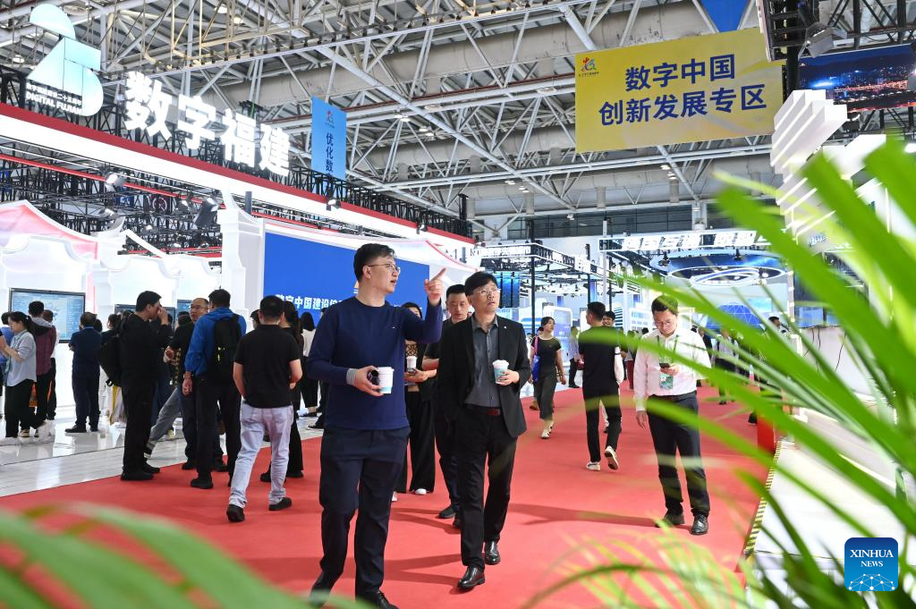 People visit the experience area of the 8th Digital China Summit in Fuzhou, southeast China's Fujian Province, April 28, 2025. With more than 300 professional institutions attending, the 8th Digital China Summit opened its experience area to professional visitors on Monday, showcasing the nation's digital transformation achievements amid robust growth in the digital sector. (Xinhua/Lin Shanchuan)