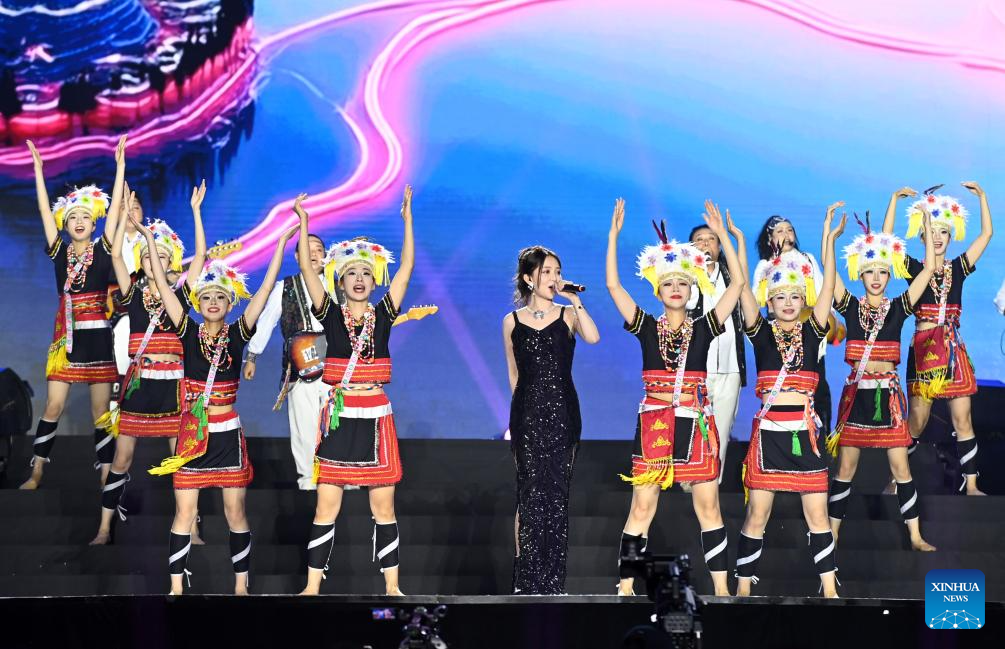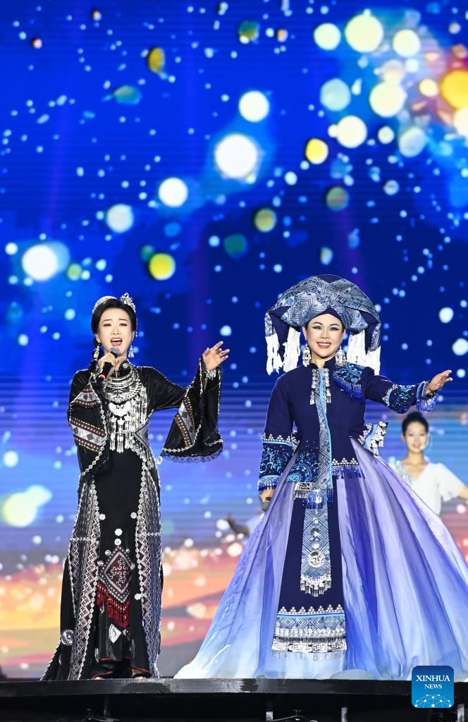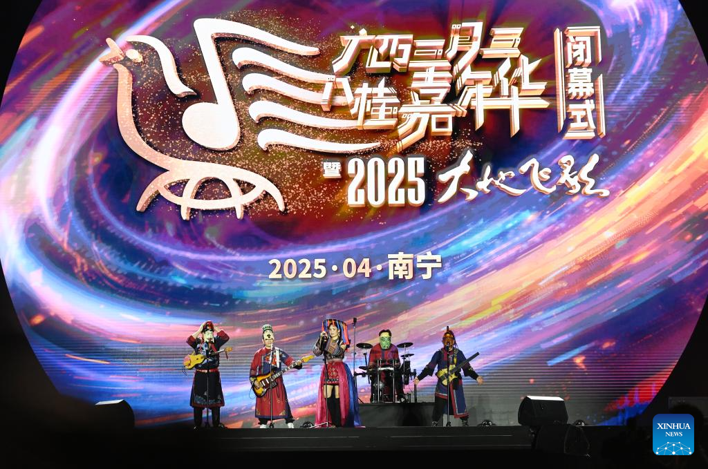 A performance is staged at the closing ceremony of a carnival in Nanning, south China's Guangxi Zhuang Autonomous Region, April 28, 2025. The carnival was held to mark the Sanyuesan Festival, a traditional festival celebrated on the third day of the third lunar month by various ethnic groups in China. (Xinhua/Lu Boan)