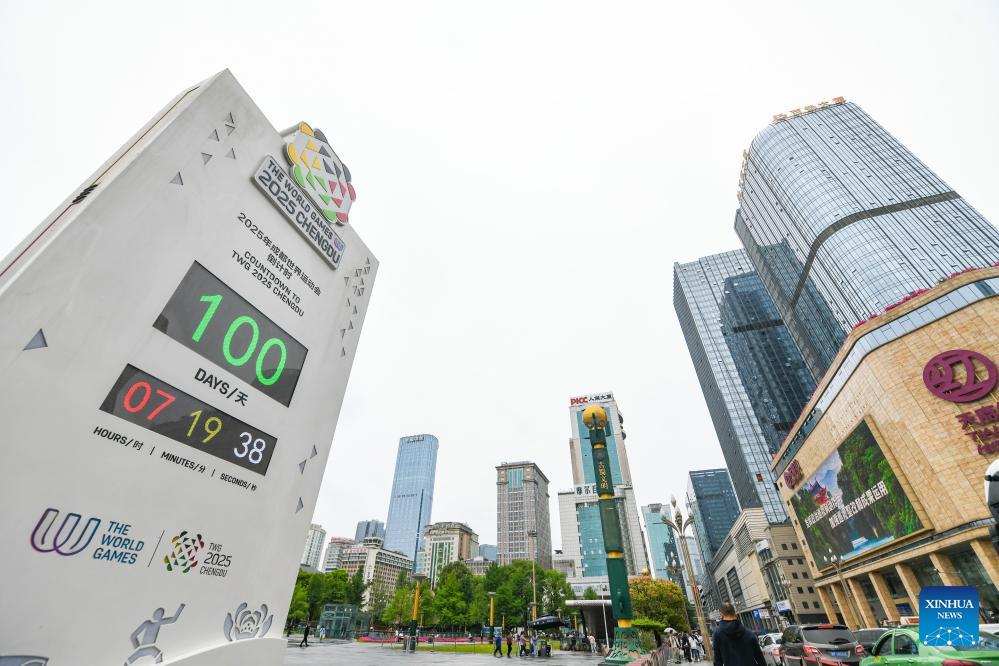 This photo taken on April 29, 2025 shows a countdown clock marking 100 days to go for the World Games 2025 in Chengdu, southwest China's Sichuan Province. The Games will be held in Chengdu from Aug. 7 to 17. (Xinhua/Wang Xi)