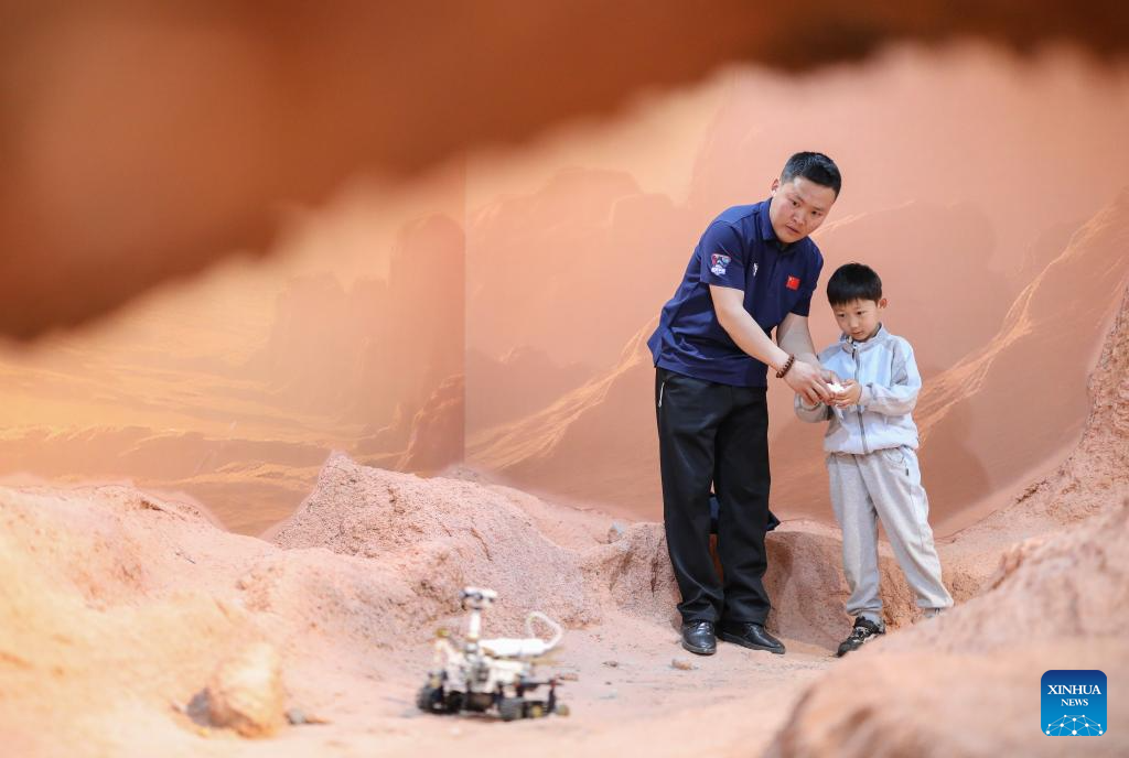 A kid tries a Mars rover module under the guidance of a docent at an aerospace science popularization base in a satellite manufacturing industrial park in Hebi, central China's Henan Province, April 21, 2025. (Xinhua/Du Xiaoyi)
