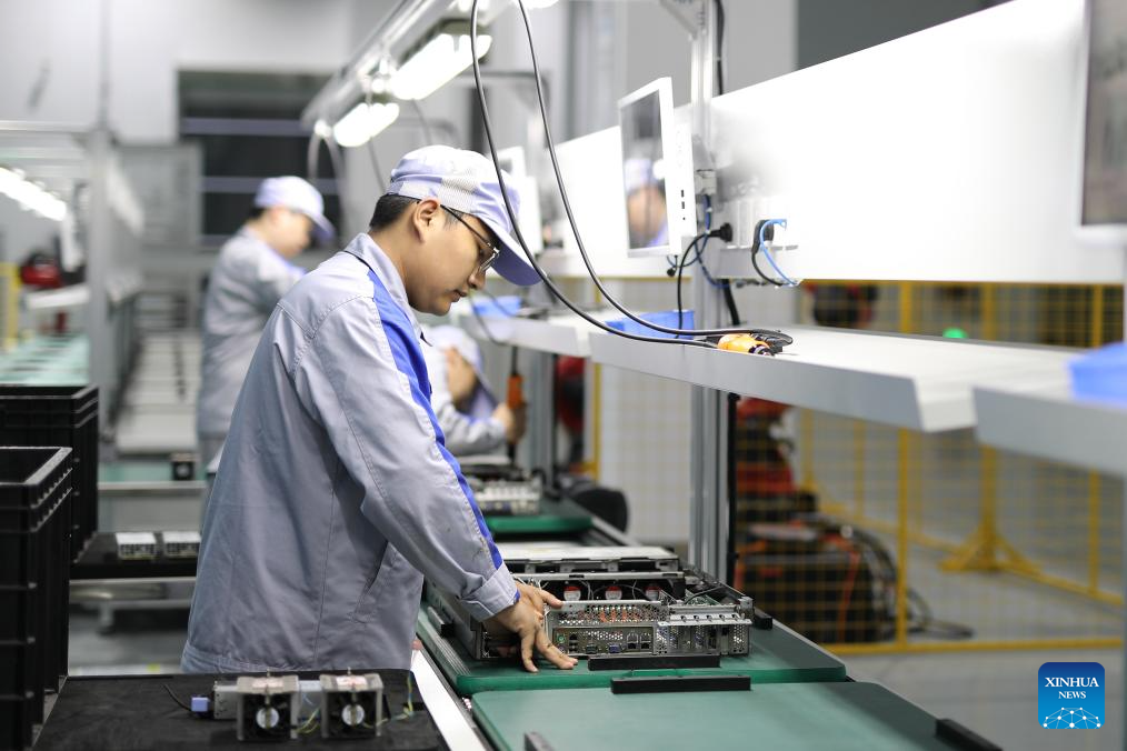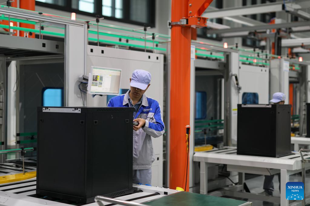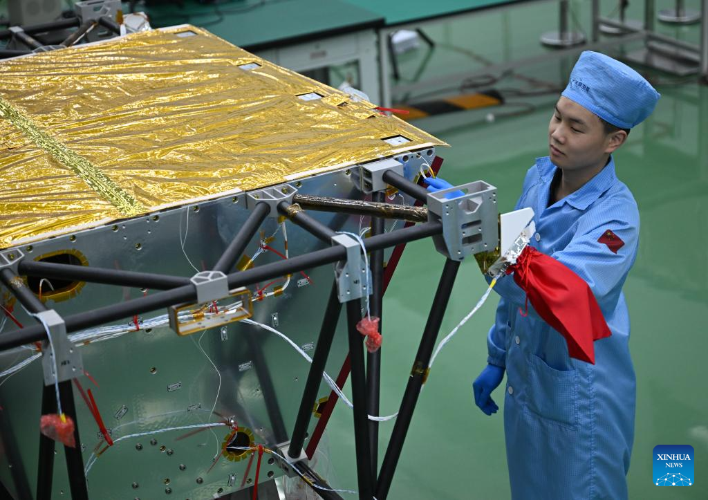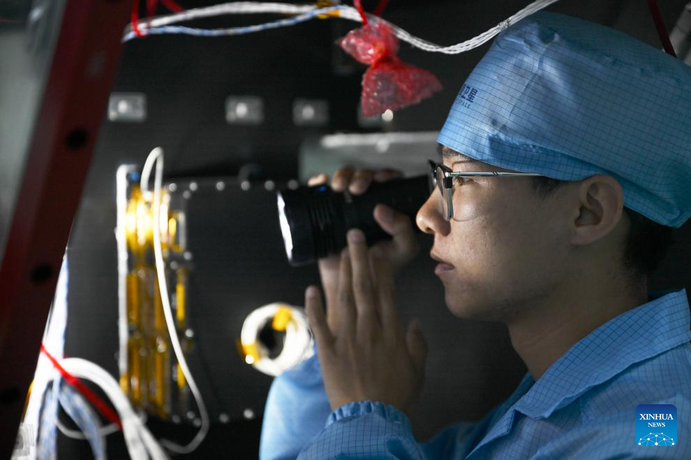 An employee checks the assembly of a satellite at a satellite manufacturing base in Hebi, central China's Henan Province, April 21, 2025. (Xinhua/Li Jianan)