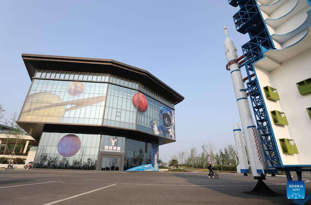 This photo taken on April 20, 2025 shows a view of an aerospace science popularization base in a satellite manufacturing industrial park in Hebi, central China's Henan Province. (Xinhua/Du Xiaoyi)