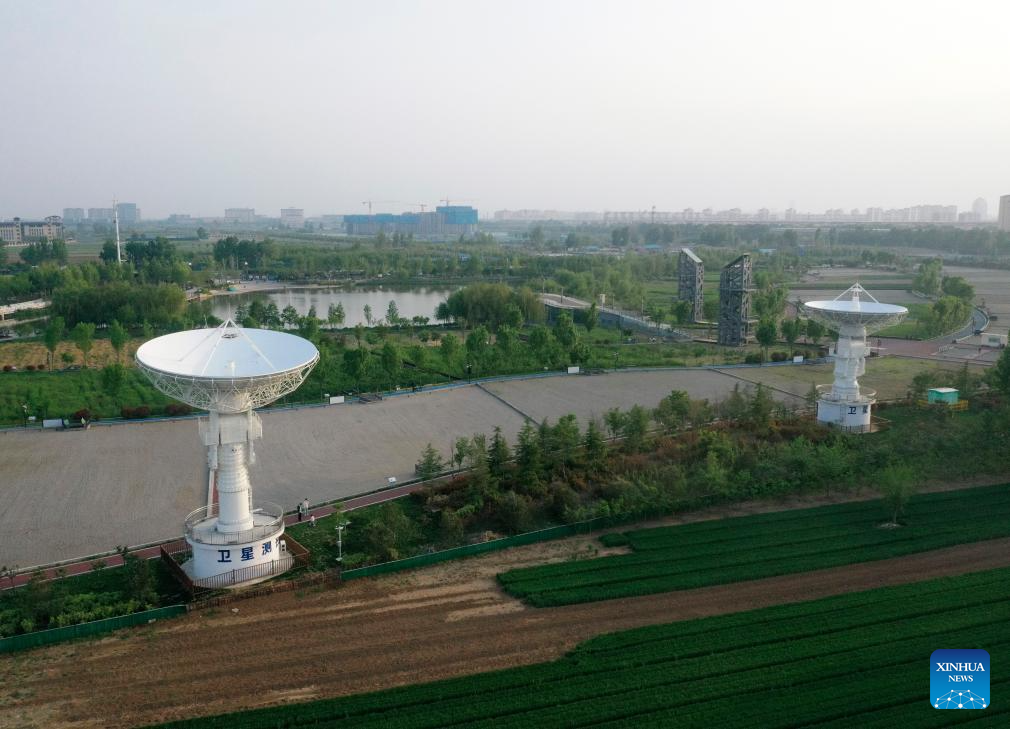 A drone photo take on April 20, 2025 shows satellite antennas near a satellite manufacturing industrial park in Hebi, central China's Henan Province. (Xinhua/Li Jianan)