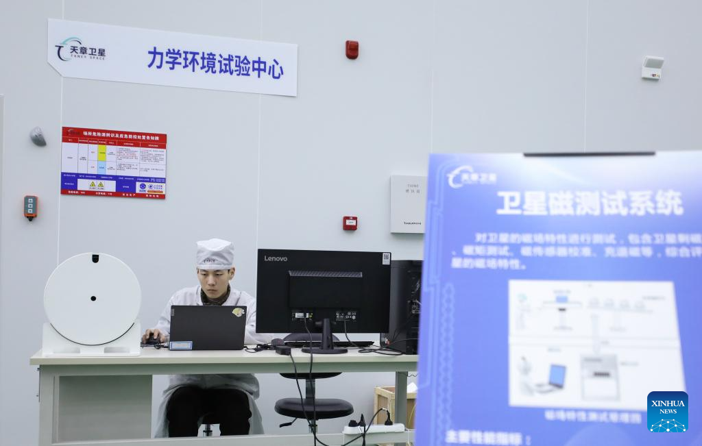 An employee works at a workshop of a satellite manufacturing base in Hebi, central China's Henan Province, April 21, 2025. (Xinhua/Du Xiaoyi)