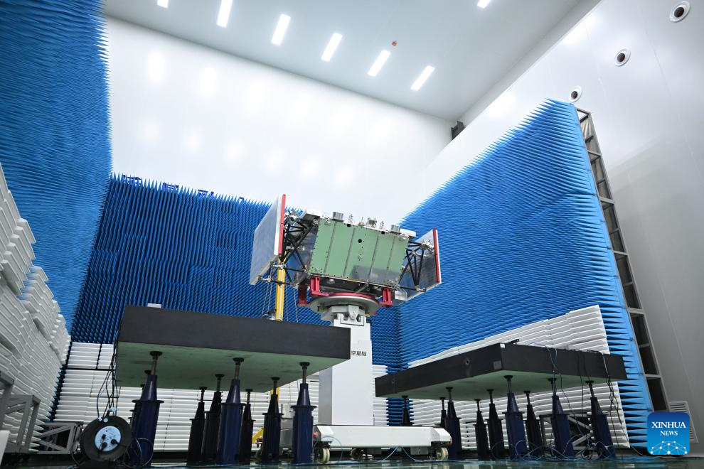 This photo taken on April 21, 2025 shows a view inside a workshop of a satellite manufacturing base in Hebi, central China's Henan Province. (Xinhua/Li Jianan)