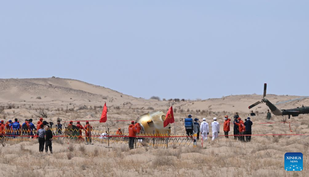 JIUQUAN, April 30 (Xinhua) -- The return capsule of the Shenzhou-19 crewed spaceship, carrying astronauts Cai Xuzhe, Song Lingdong and Wang Haoze, touched down at the Dongfeng landing site in north China's Inner Mongolia Autonomous Region on Wednesday.