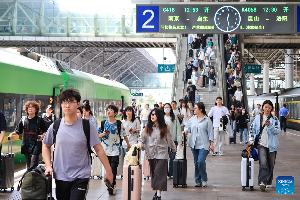 Passengers enter the Nanjing Railway Station in Nanjing, east China's Jiangsu Province, April 30, 2025. China's railway network is expected to handle approximately 144 million passenger trips during the eight-day May Day holiday travel rush, which kicked off on Tuesday, the national railway operator said. (Photo by Su Yang/Xinhua)