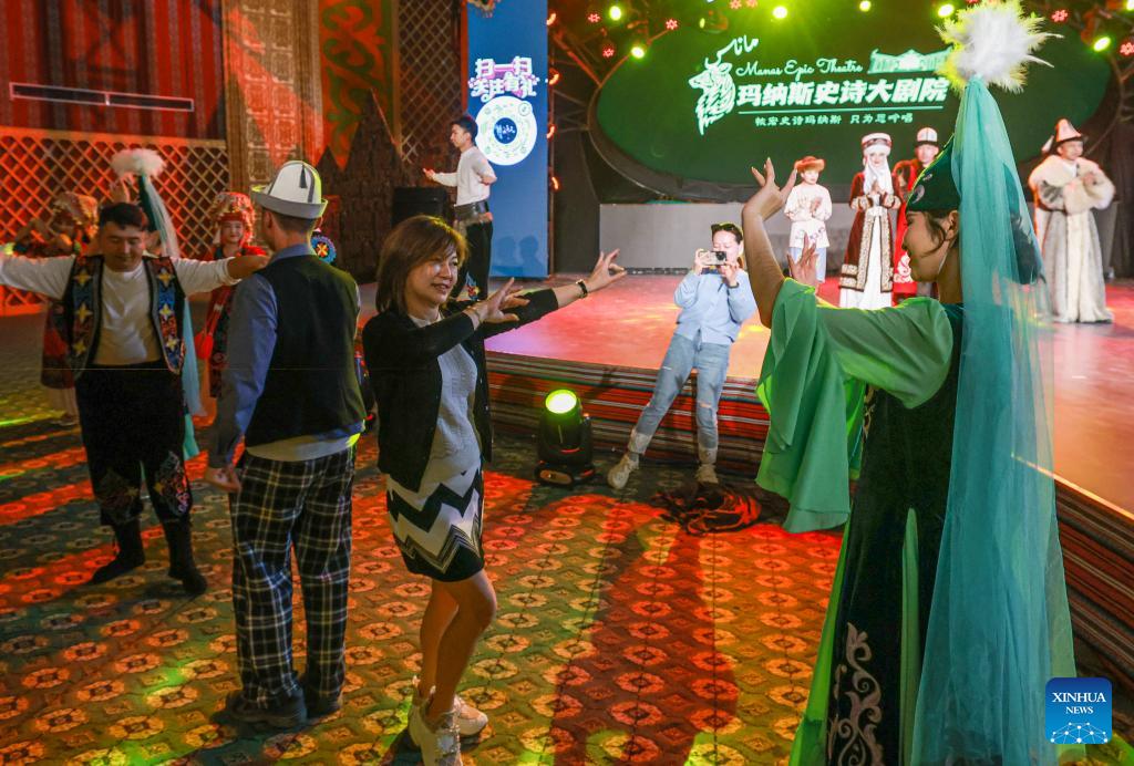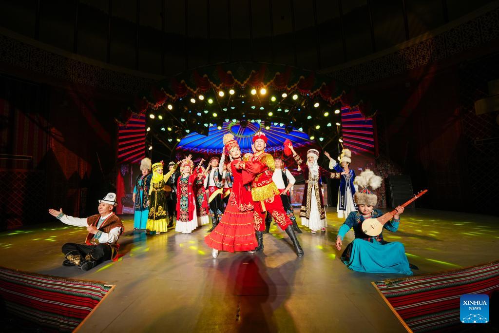 Artists and visitors dance to music at a local theater in Artux City, Kizilsu Kirgiz Autonomous Prefecture in northwest China's Xinjiang Uygur Autonomous Region, April 22, 2025. (Xinhua/Wang Fei)