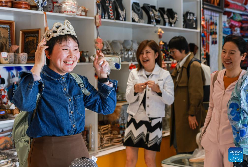 A tourist tries on ethnic costumes after a "Manas" epic show at a folklore park in Artux City, Kizilsu Kirgiz Autonomous Prefecture in northwest China's Xinjiang Uygur Autonomous Region, April 22, 2025. (Xinhua/Wang Fei)