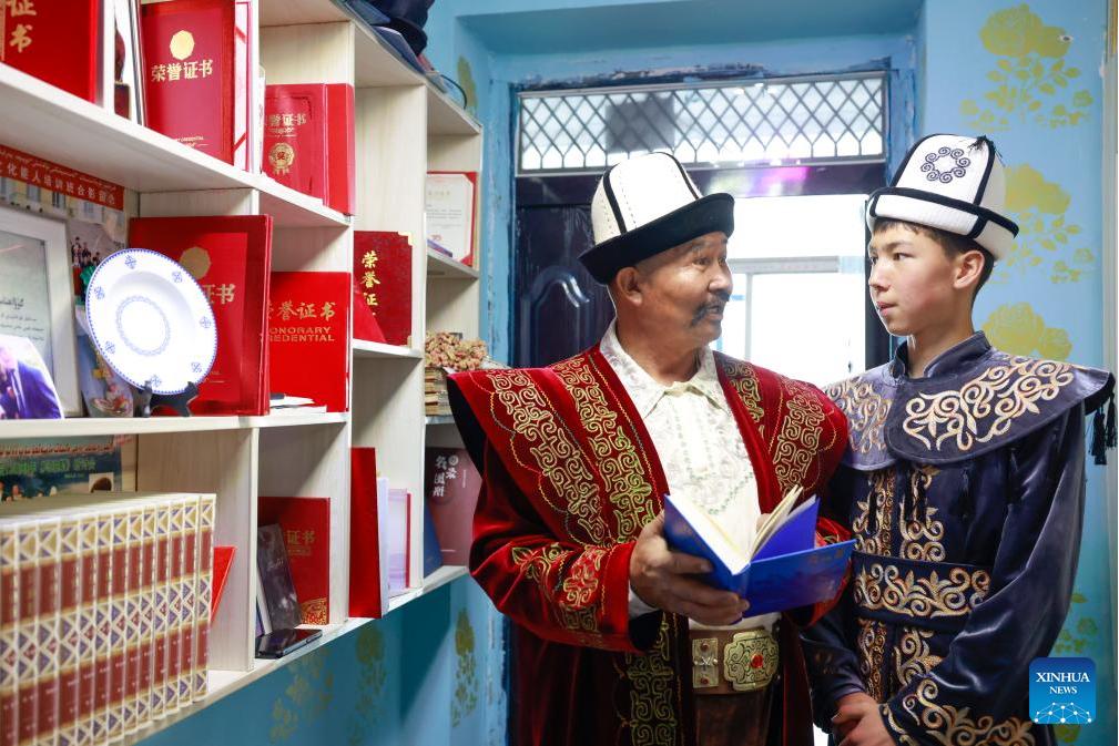 Jannur Turganbay (L), a representative inheritor of the "Manas" epic, explains the history of "Manas" to his apprentice at his home in Artux City, Kizilsu Kirgiz Autonomous Prefecture in northwest China's Xinjiang Uygur Autonomous Region, April 21, 2025. (Xinhua/Wang Fei)