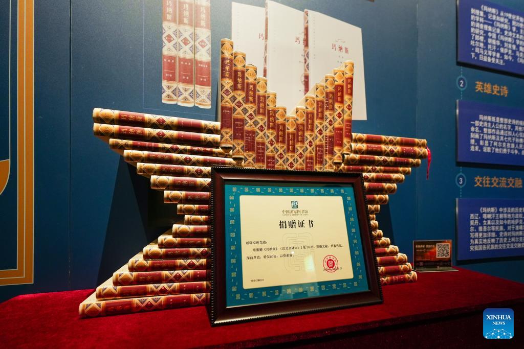 This photo taken on April 22, 2025 shows the Chinese version of "Manas" displayed at a local museum in Kirgiz Autonomous Prefecture of Kizilsu in northwest China's Xinjiang Uygur Autonomous Region. (Xinhua/Xu Hongyan)